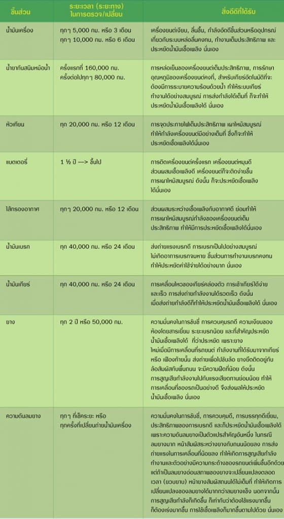รายการต่างๆที่กระทำทุกระยะทางนั้น จะเกิดผลดีอย่างมากต่อเจ้าของรถยนต์และตัวรถยนต์ด้วย ดังนั้นเพื่อความเข้าใจมากขึ้น ขอเสนอตัวอย่างบางรายการในรูปแบบของตาราง ดังนี้