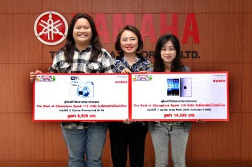 นางสาวจินตนา อุดมทรัพย์ ผู้จัดการใหญ่ด้านการค้า บริษัท ไทยยามาฮ่ามอเตอร์ จำกัด (คนกลาง) มอบรางวัล มินิ ไอแพด และกล้องดิจิตอล แคนนอน พาวเวอร์ช็อต เอส 110 แก่นางสาวสกุณา กิจไกรวัลย์ และตัวแทนของนางนิภาศรี จริยาเลิศศักดิ์ ผู้โชคดีที่ร่วมกิจกรรมทายผลการแข่งขัน “เดอะ เบสท์ ออฟ แชมเปี้ยน สปาร์ค 115 หัวฉีด ขับขี่ประหยัดน้ำมันทั่วไทย” ณ สำนักงานใหญ่ บริษัท ไทยยามาฮ่ามอเตอร์ จำกัด เมื่อเร็ว ๆ นี้