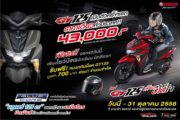 Yamaha GT125 มากับราคาในช่วงแนะนำเริ่มต้นที่ 43,000 บาท พร้อมโปรโมชั่นสำหรับนักเรียน นักศึกษา รับหมวกกันน็อค GT125 มูลค่า 700 บาท ฟรี! พร้อมวางจำหน่ายพร้อมกันทั่วประเทศวันที่ 17 สิงหาคม นี้ ที่ร้านผู้จำหน่ายรถจักรยานยนต์ยามาฮ่า