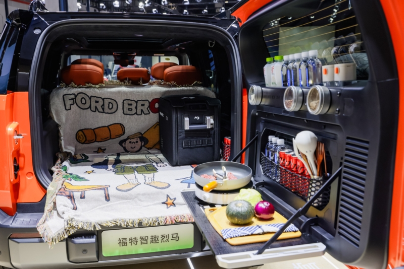 ภายใน Ford Bronco เวอร์ชันจีนคือจัดเต็มมาก มาพร้อมกับพวงมาลัย D-Shape สปอร์ต หน้าจอ AR-HUD ขนาดยักษ์ 70 นิ้ว หน้าจอกลาง 15.6 นิ้ว ความละเอียด 2.5K ชิป Qualcomm Snapdragon 8255 ตู้เย็นในคอนโซล 7.5 ลิตร (อุณหภูมิ -6 ถึง 50°C) ลำโพง 21 ตัว หลังคาซันรูฟพาโนรามา ถุงลมนิรภัย 10 จุด โดยรุ่น BEV จะมี frunk หน้าขนาด 160 ลิตร