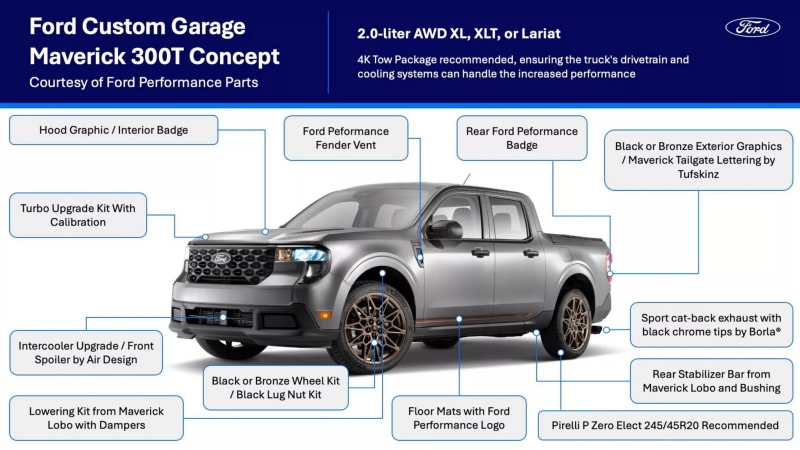 ชุดแต่ง 300T Performance Kit ใช้ได้กับ Ford Maverick รุ่น XL, XLT และ Lariat ที่มาพร้อมเครื่องยนต์ 2.0L AWD และ Ford ยังแนะนำให้ติดตั้งคู่กับ แพ็กเกจลากจูง 4K Tow Package เพื่อช่วยระบายความร้อนระบบเกียร์และขับเคลื่อน