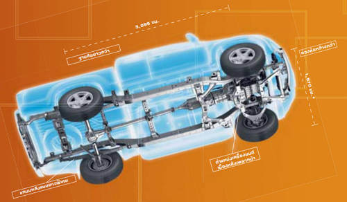 ช่วงล่างหน้าแบบอิสระปีกนก 2 ชั้น พร้อมคอยล์สปริง ผสานช่วงล่างหลัง แบบแหนบยาวพิเศษ Long Span ดุลยภาพแห่งการยึดเกาะถนนทรงตัวเป็นเยี่ยม ให้ความนุ่มหนึบบนถนนที่ใช้ความเร็ว และนุ่มนวลเมื่ออยู่บนเส้นทางขรุขระ ลดความเหนื่อยล้าแม้เดินทางไกล