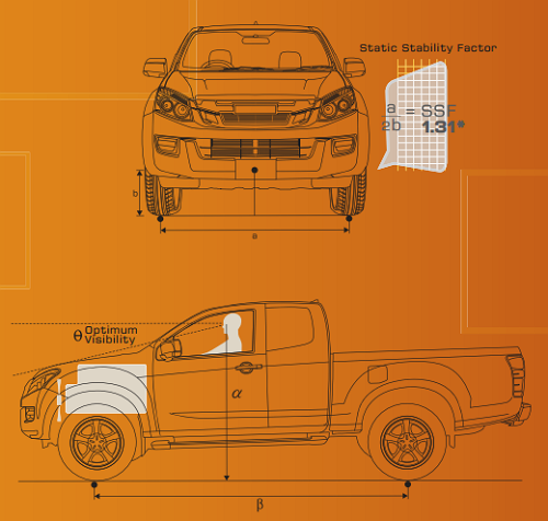 ค่าสัมประสิทธิ์แห่งการทรงตัวที่เหนือกว่าตามแบบฉบับอีซูซุ เพื่อให้ได้เสถียรภาพแห่งการทรงตัวที่ดียิ่งกว่า พร้อมออกแบบตำแหน่งที่นั่งให้ผู้ขับขี่เป็นหนุ่งเดียวกับรถ ทั้งการมองเห็นและรับรู้ได้ถึงการตอบสนองของตัวรถในสภาวะต่างๆ ให้การบังคับควบคุมเป็นเรื่องง่าย สนุกเร้าใจได้ทุกเวลาที่ขับขี่