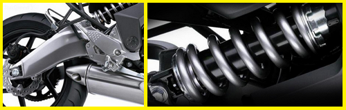 โช้คอัพหลังเดี่ยวนอนช่วงชักยาว ช่วยดูดซับแรงสะเทือนจากถนนที่ขรุขระได้อย่างนุ่มนวล ด้วยการยึดโช้คกับเฟรมโดยตรง ทำให้ผู้ขับขี่เข้าใจทุกสภาวะพื้นผิวถนนและสามารถปรับความแข็งโช้คได้ตามต้องการ อีกทั้งสวิงอาร์มอลูมิเนียมทรงปีกนก มีน้ำหนักเบา ลดแรงกระแทกในขณะขับขี่ได้อย่างนุ่มนวล เหมาะกับการขับขี่ทุกสภาพถนน