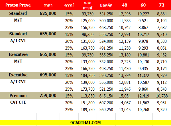 โปรตอน เพรเว่ ราคา, ตารางราคา-ผ่อน-ดาวน์