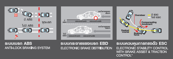 HIGH PERFORMANCE BRAKING ควบคุมหยุดรถอย่างมั่นใจในทุกสถานการณ์ด้วยการทำงานร่วมกันของระบบป้องกันล็อค ABS ระบบกระจายแรงเบรก EBDและเสริมแรงเบรก BA* Traction Control ช่วยให้คุณสามารถควบคุมรถได้อย่างมั่นคงแม้ในสถานะการณ์คับขัน