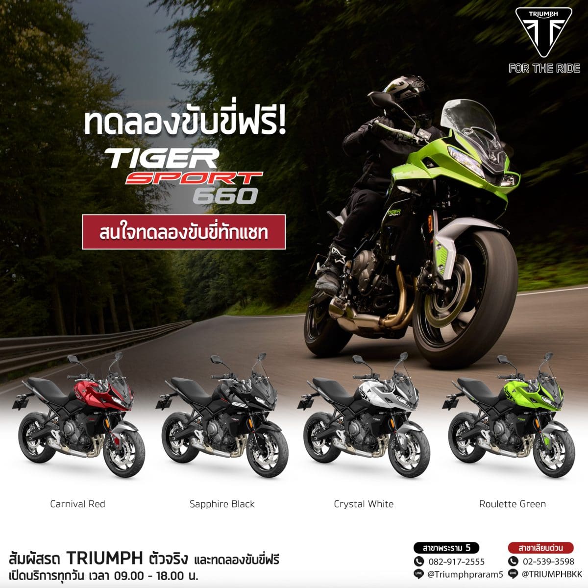 Triumph Tiger Sport 660 มีให้เลือกทั้งหมด 4 สี ได้แก่ 1.สีดำ Sapphire Black  2.สีเขียว Roulette Green  3.สีขาว Crystal White  4.สีแดง Carnival Red