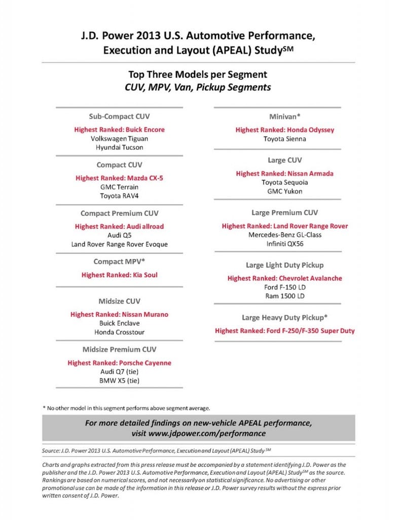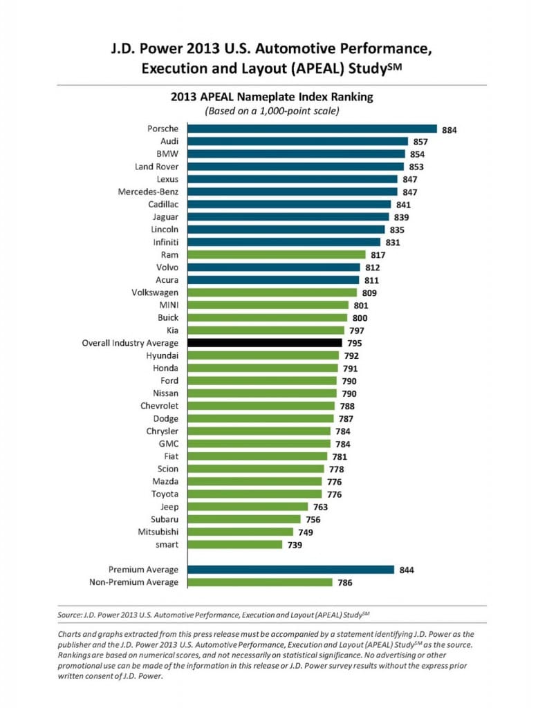 สำหรับในปี 2013 นั้นค่ายรถอย่าง ปอร์เช่ ก็ได้เป็นผู้ชนะในส่วนนี้ไป ตามมาด้วยค่ายรถยนต์อย่าง Audi, BMW, Cadillac และ Land Rover แต่ในส่วนของตำแหน่งรองแชมป์เมื่อปีที่แล้วอย่าง Jaguar นั้นอันดับตกลงอย่างน่าใจหาย และฝั่งของท้ายตารางได้แก่ Smart, Mitsubishi, Subaru และ Jeep
