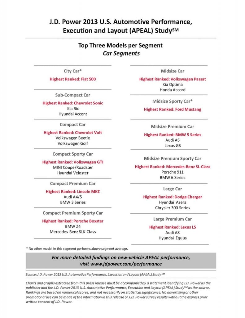 และด้วยเทคโนโลยีใหม่ๆที่ก้าวเข้ามานั้นจะเป็นปัจจัยที่ทำให้ค่ายรถยนต์ต่างๆแข่งขันกันนอกเหนือไปจากราคาที่ประหยัดและมาตรฐานการผลิตที่แข่งขันกันมาโดยตลอด ทำให้ล่าสุดหน่วยงามอย่าง J.D. Power ได้ทำการสำรวจและคำนวนถึงศักยภาพด้านการออกแบบและรูปลักษณ์ของรถยนต์จากค่ายต่างๆ