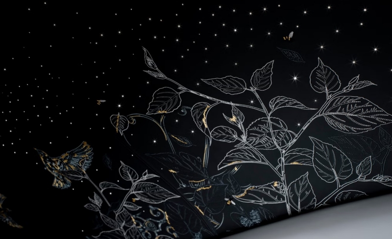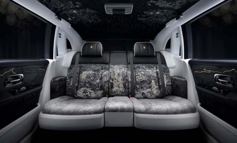 เพดาน “Starlight Headliner” ปักด้วยเส้นด้ายกว่า 440,000 เข็ม เป็นภาพต้นหม่อน (Mulberry Tree) จากสวนของ Sir Henry Royce พร้อมผึ้งและนกเล็กซ่อนอยู่ระหว่างดวงดาวระยิบระยับ