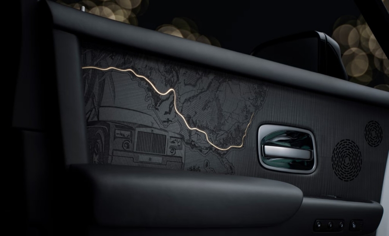 แผงประตูและโต๊ะพับด้านหลังใช้ไม้ Blackwood ที่แกะลายภูมิประเทศซึ่งเกี่ยวข้องกับการเดินทางครั้งสำคัญของแบรนด์ เช่น ชายฝั่ง Le Rayol-Canadel-sur-Mer ที่ Royce ใช้พักผ่อนในฤดูหนาว บ้านฤดูร้อนของเขาที่ West Wittering และเส้นทางข้ามออสเตรเลียกว่า 4,500 ไมล์