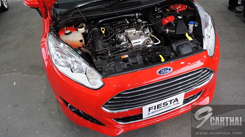 เครื่องยนต์ EcoBoost 3 สูบ ขนาด 1.0 ลิตร เล็กกะทัดรัด กว้างยาวประมาณกระดาษ A4 น้ำหนักเบาเพียง 97 กิโลกรัม แต่ให้กำลังสูงมากถึง 125 แรงม้า แรงบิดที่สูงเหลือเชื่อถึง 170Nm เท่ากับเครื่องยนต์ 1.6 ลิตร ประหยัดน้ำมันมากกว่า Fiesta ปกติประมาณ 20%